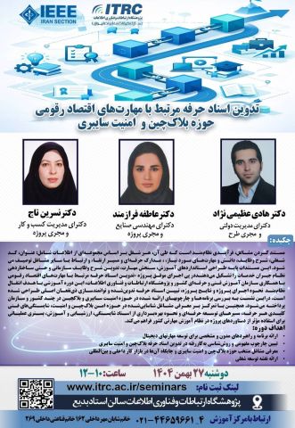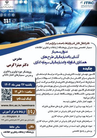زمان: یکشنبه ۲۶ بهمن ماه ۱۴۰۴  ساعت: ۱۰ الی ۱۲  مکان: پژوهشگاه ارتباطات و فناوری اطلاعات (سالن حافظ)  تلفن ارتباط با مرکز آموزش : ۴-۴۴۶۵۹۶۶۱- ۰۲۱ داخلی (۱۶۲) - ( ۲۶۹)