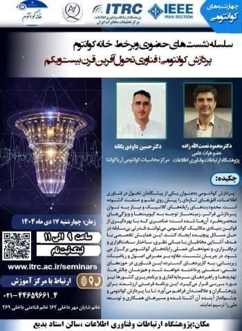 *زمان:* چهارشنبه 17 دی ماه ساعت  9 الی 11 *مکان:* پژوهشگاه ارتباطات و فناوری اطلاعات- طبقه M-  سالن استاد بدیع لینک ثبت نام: https://www.itrc.ac.ir/seminars