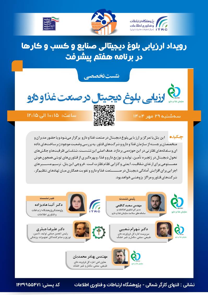 رویداد ملی «ارزیابی آمادگی دیجیتالی صنایع و کسبوکارها» در 28 و 29 مهرماه ۱۴۰۴ در پژوهشگاه ارتباطات و فناوری اطلاعات و با مشارکت دستگاهها و نهادهای کلیدی برگزار میشود. این رویداد شامل ارائه گزارش پیشارزیابی ملی، نشستهای تخصصی، و کارگاههای آموزشی خواهد بود.